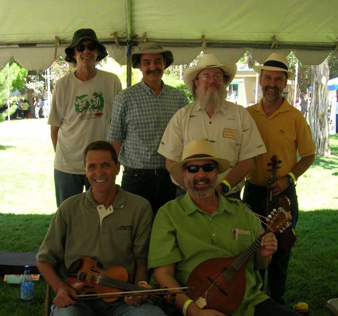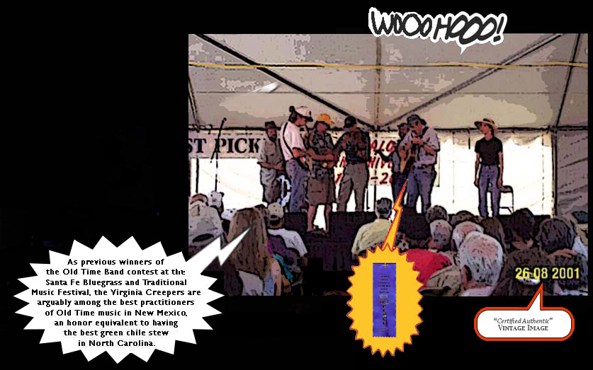 The Virginia Creepers have been playing Appalachian old-time stringband music since 1991. The original members, Steve Huestis (banjo), Rick Olcott (guitar) and Peter White (fiddle) met at a jam sponsored by the New Mexico Folk Music and Dance Society (NM FolkMADS) and decided to launch a band. They were joined by Scott Mathis (mandolin, guitarron) shortly thereafter. Bruce Thomson (fiddle) came on board sometime in the late 90's. Around that same time Scott relocated to CO for a few years, and Laurie Phillips took over the mandolin duties. Over the years, the Creepers have had more bass players than Spinal Tap had drummers. Richard Heggen and Greg Donohoe both put in some quality time, Matt Day played with the band briefly, and some Creeper family members were occasionally drafted - like bass wiz Blake Thomson, and Jane Phillips, who wasn't even a bass player. Desperate Creepers call for desparate measures.